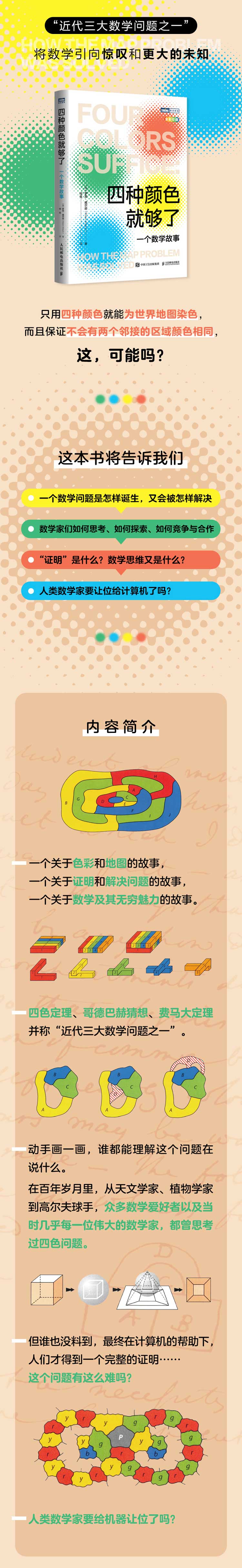 《四种颜色就够了:一个数学故事》是一部深入浅出地讲述数学史上著名难题“四色定理”的科普著作,由英国数学家罗宾·威尔逊撰写。全书以“四色问题”为核心,通过生动的叙事将数学探索的曲折历程娓娓道来,展现了人类如何用百年时间攻克一个看似简单的命题:是否只需四种颜色就能为任意地图着色,且保证相邻区域颜色不同。这一命题与哥德巴赫猜想、费马大定理并称为“近代三大数学难题”,却因最终依赖计算机证明而引发数学哲学的革命性争议。